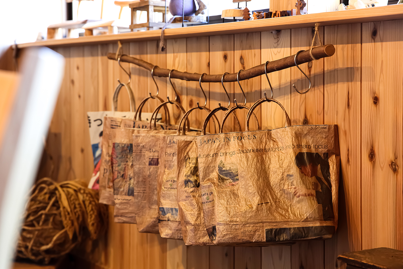 築100年の古民家を改装したギャラリーへ。ものづくりを愛する児島さん夫婦が営んでおり、ご本人たちや村のアーティストが手がけた雑貨などが販売されています。新聞を使ったバッグづくりのワークショップ「エコクラフト体験」も開催。